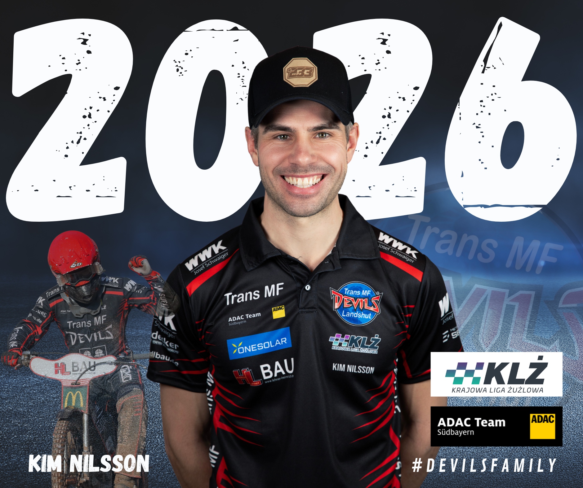 Die Verantwortlichen der Trans MF Landshut Devils hatten den Wunsch, mit einem nahezu unveränderten Kader in die Saison 2026 gehen zu können. Nach den Vertragsverlängerungen von Leon Flint, Mario Häusl, Charles Wright und Erik Riss wurde nun das nächste Puzzleteil fixiert. Der schwedische Topfahrer Kim Nilsson verlängert in der Ellermühle und geht somit in seine fünfte Saison bei den Niederbayern. Der 35-jährige Routinier zählt seit Jahren zu den Topfahrern der Liga und war auch in der abgelaufenen Saison mit einem Punkteschnitt von 2,167 Punkten pro Lauf unter den Top 6.