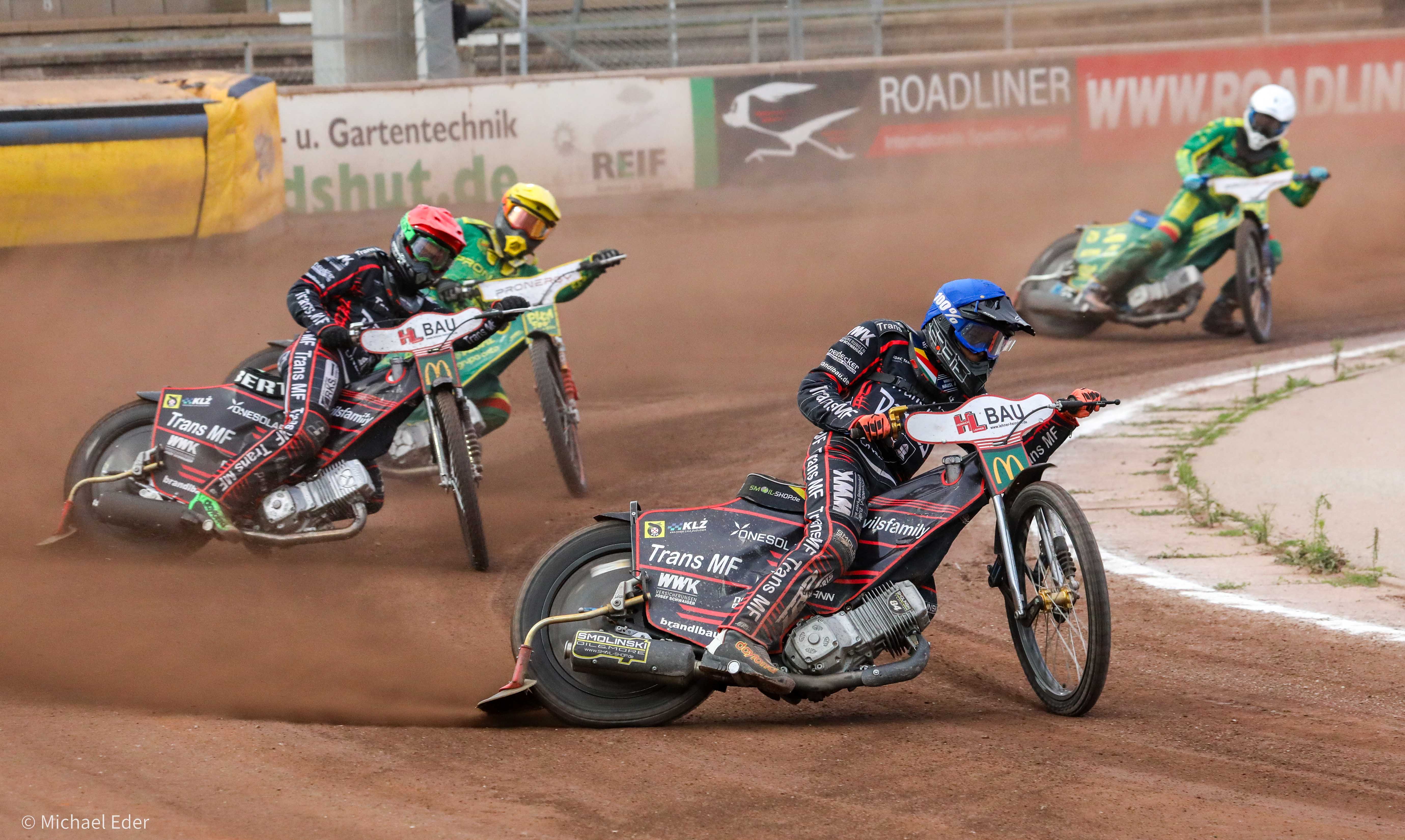 Daß die Stahlschuhartisten der Trans MF Landshut Devils sich für das Flutlichtrennen am gestrigen Samstag nichts anderes als einen weiteren Heimsieg auf die Fahnen geschrieben hatten, wurde relativ rasch klar. Schon im Auftaktheat ging es gut zur Sache, Kevin Wölbert konnte das Duell gegen Wiktor Jasinski letztlich für sich entscheiden und fuhr als erster über die Zielline, während sein Teamkollege Kevin Juhl Pedersen Adrian Cyfer in Schach halten konnte. Im Lauf der Junioren glich Pila dieses erste 4:2 sofort aus, wobei es Mario Häusl noch gelang, sich zwischen Piotr Piotrowski-Predki und Jakob Zurek zu schieben und somit eine Führung des Gegners zu verhindern. Ab Heat drei dann waren die Devils in Führung und gaben diese auch nicht mehr ab, ja bauten sie bis Heat 11 bis zu vierzehn Punkte aus. Das erste 5:1 holte Kim Nilsson nach gelungenem Start mit großem Vorsprung, vor Charles Wright, Norbert Kosciuch und Jonas Seifert-Salk. Mehr als eine Schrecksekunde gab es dann im vierten Durchgang, als Valentin Grobauer zum Angriff auf Krzysztof Sadurski ansetzte, dabei aber in der Zielkurve in die Bande einschlug. Der nach ihm fahrende Jakub Zurek kam ebenfalls noch zu Sturz. Zurek konnte letztlich zu Fuß wieder ins Fahrerlager zurückkehren, Grobauer zunächst im Krankenwagen; glücklicherweise folgte aber bald die Information, daß er von einer schlimmeren Verletzung verschont geblieben war. Den Wiederholungslauf gewannen die Gäste mit 2:4, doch dann waren erst einmal wieder die Devils dran. Bis zu Heat 11 gab es je zwei weitere 5:1 und 4:2 für die Gastgeber, die restlichen Läufe endeten unentschieden, wobei es meist die Devils waren, die die Ziellinie als erste überfuhren. Eine absolute Sternstunde hatte Mario Häusl gemeinsam mit Kevin Wölbert in Heat sieben, als es diesen gelang, den angreifenden Jonas Seifert-Salk auszubremsen und einen sicheren Sieg einzufahren. Noch einmal konnten die Gäste aus Pila ihren Rückstand kurz durch ein 1:5 von Wiktor Jasinski und Piotr Piotrowski-Predki gegen Marlon Hegener – Kevin Juhl Pedersen war gestürzt und zum Rerun nicht mehr zugelassen – verkürzen, doch am Ende machten die Devils den Sack souverän zu und gewannen mit 51:39 deutlicher, als es so manch einer gegen den starken Gegner Pronergy Polonia Pila erwartet haben wird.